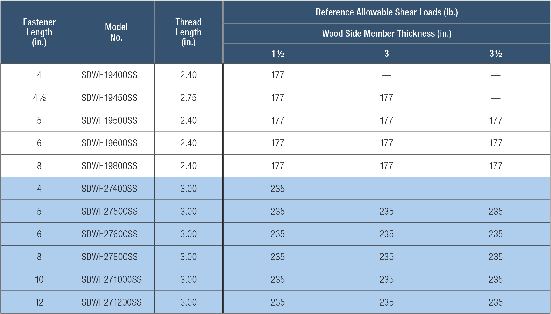 1. All applications are based on full penetration into the main member. Full penetration is the screw length minus the side member thickness.